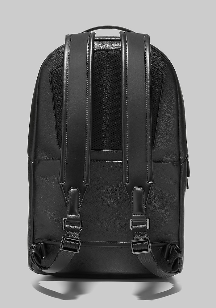Product description From Cole Haan, the Triboro backpack is perfect for both quick overnight trips and your morning commutes. With a padded, interior laptop sleeve and extra padded straps, this backpack will keep you traveling in style and comfort no matter how long the journey takes. In a genuine pebbled leather. Interior padded laptop case Front pocket Adjustable, padded shoulder straps for added comfort Carrying handle on top Zippered closures Luxe yet durable pebbled leather Spot clean only Imported