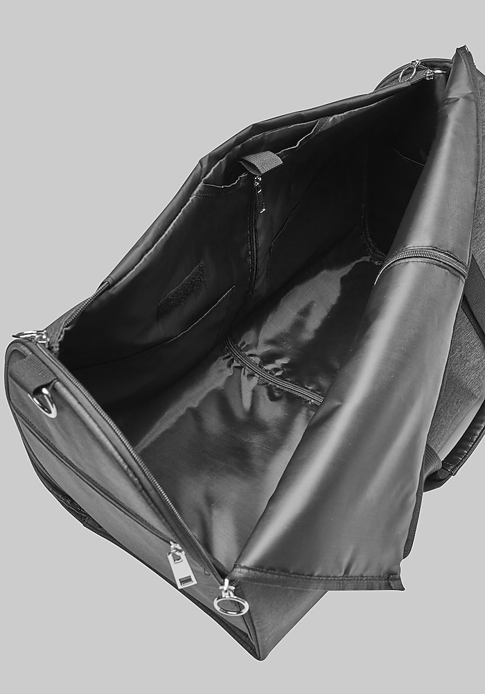Product description Be it a work trip, conference, wedding, or special event, this 2-in-1 bag means business. From Duchamp, this handy travel set embodies a garment bag with a large suit compartment and a multipurpose duffle bag. Once you’ve place your fine dress attire in the garment bag, they can then be carried in the duffle bag by either the top handles, detachable and adjustable strap, or attached to your luggage with the trolly strap. Designed to fit in an airplane overhead bin, the duffle doubles as its own carry-on bag with multiple zip compartments including shoe pouches on both sides so your can be ready from head to toe.