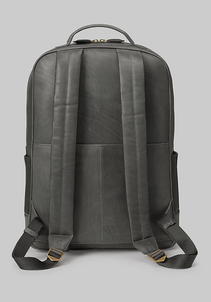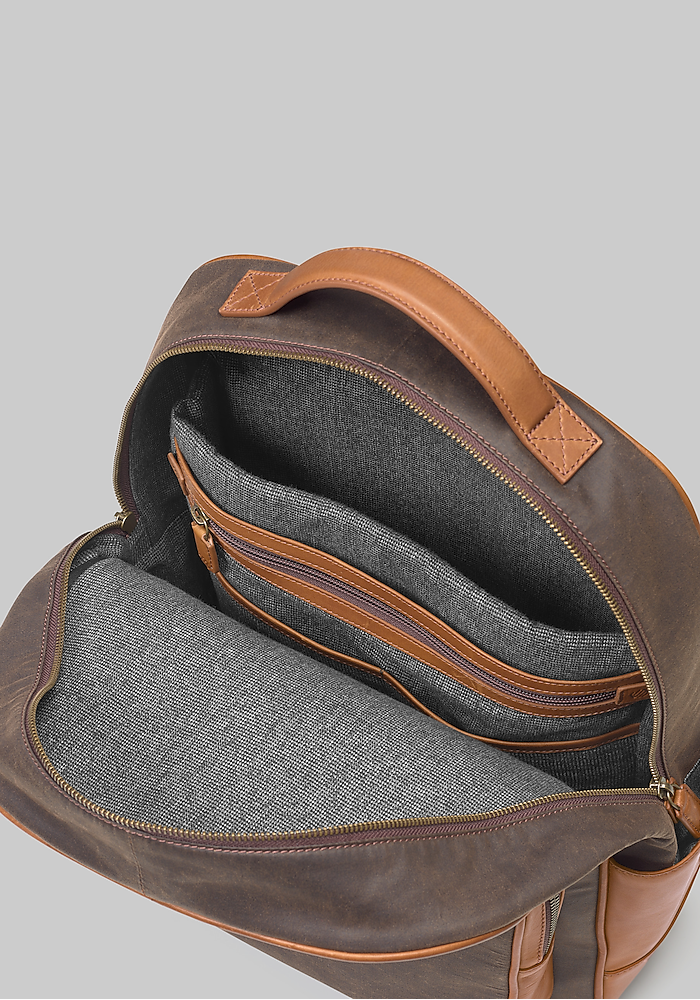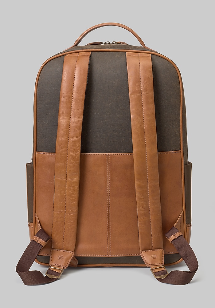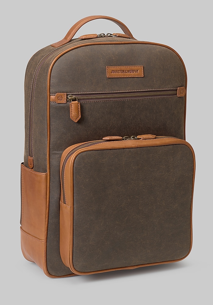 Product description Fashioned from smooth, full-grain leather that gains character over time, the Rhodes Backpack from Johnston & Murphy features antiqued brass hardware and durable cotton twill lining in custom plaid. This sleek bag is ready to go the distance with multiple compartments to keep you organized, a laptop sleeve, elasticized sized pockets for your bottled beverages, and a back sleeve to fit over your rolling luggage as you travel.