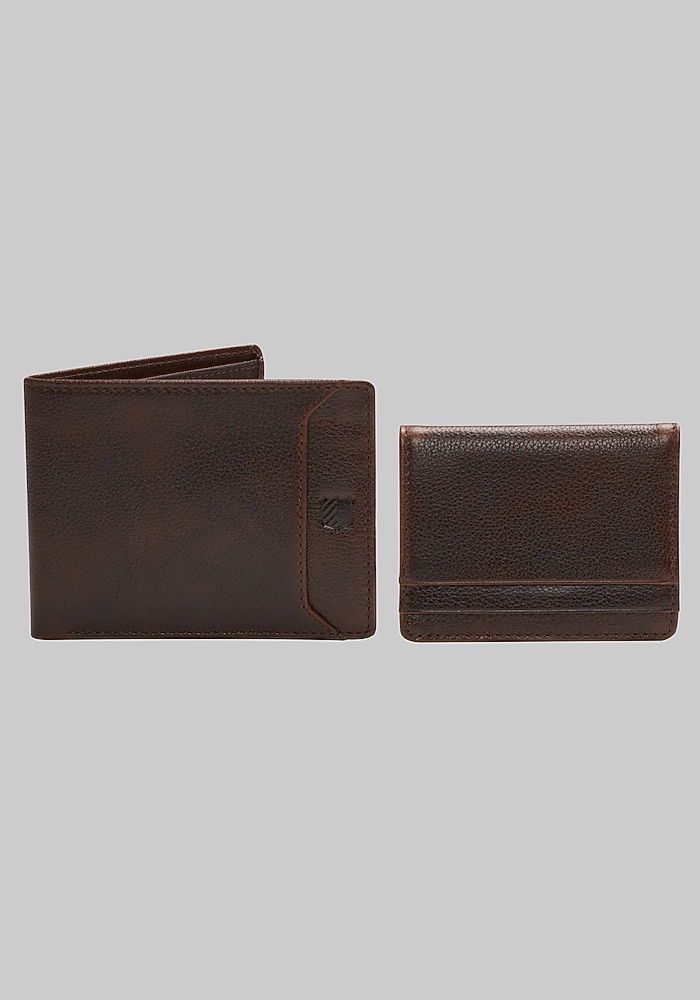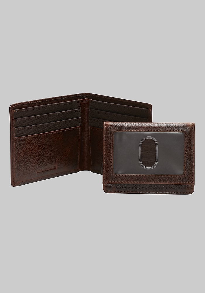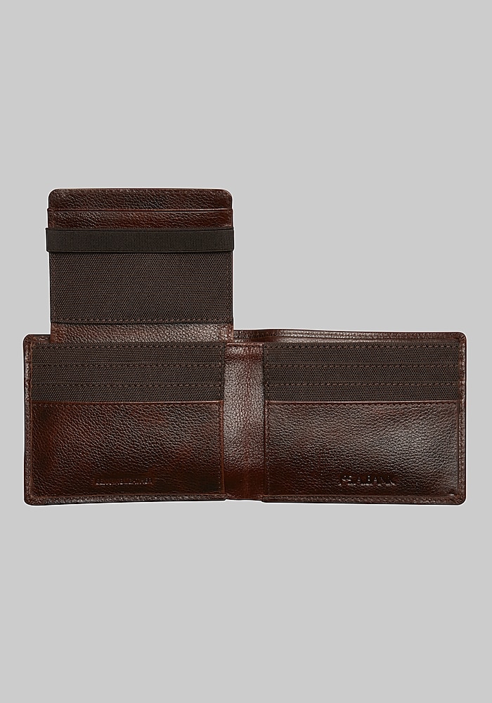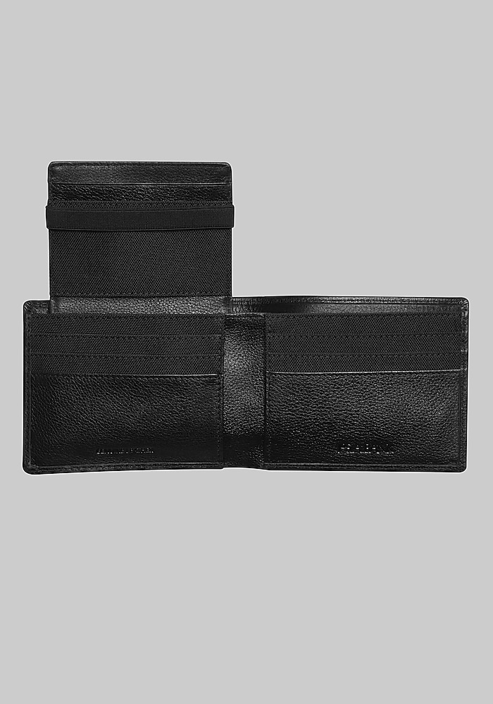 Product description Cover all your needs from workday to weekend to getaway with this complete yet compact 3-in-1 wallet. Made from richly pebbled leather, this essential Jos. A. Bank accessory includes a bi-fold wallet, a flip-up pass wallet for anything from your ID to your transportation pass, and a convenient credit card wallet with an elastic closure. Contains bi-fold wallet, flip-up pass wallet, and credit card wallet with elastic closure Genuine leather Imported