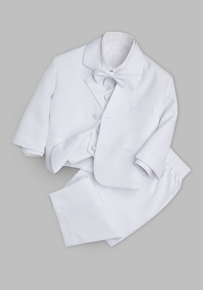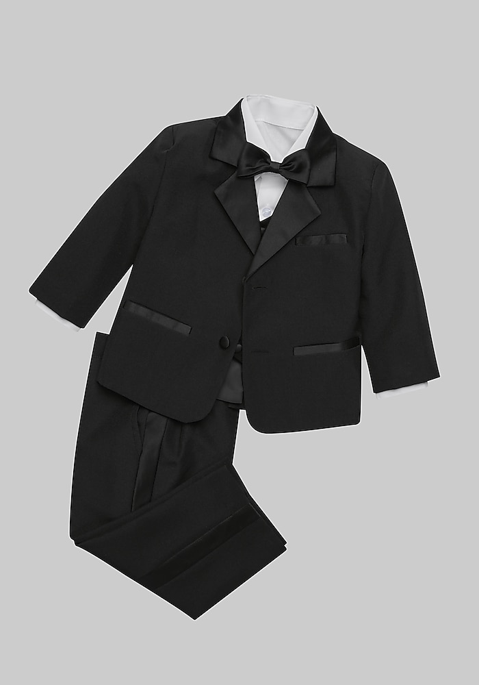 Product description Create a sophisticated look for your little gentleman in this five-piece toddler tuxedo set. Tailored with a Slim Fit, this children’s suit is perfect for weddings, especially for ringbearers, and any other formal wear occasion. Fashioned with satin details throughout, this dapper ensemble comes complete with a dress shirt, pre-tied bow tie, vest, jacket, and pants. Slim Fit Two-button, satin notch-lapel, fully lined jacket Four-button vest Flat-front, satin-stripe, pull-up pants Polyester blend Dry clean only Imported