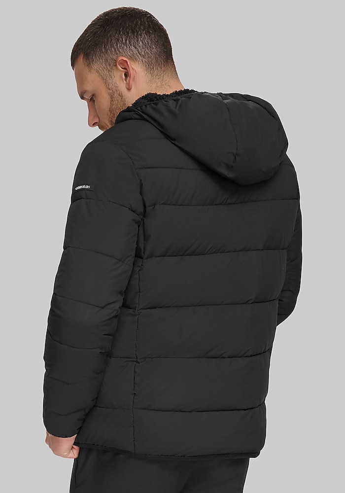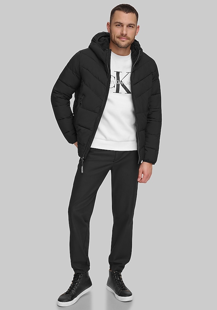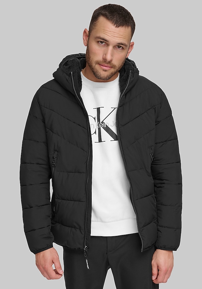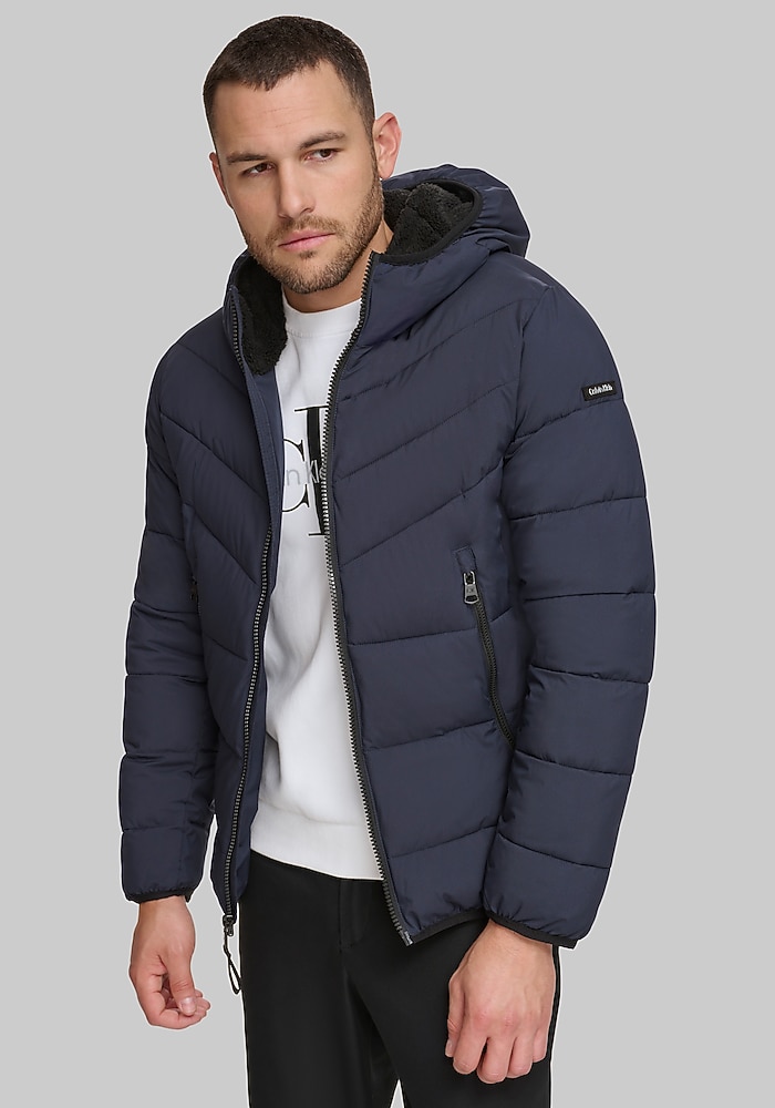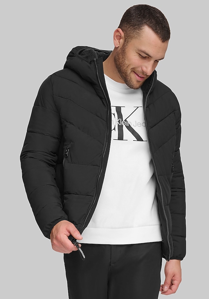 Product description Designed for movement and modern style, this Tailored Fit hooded jacket from Calvin Klein offers a trim, minimalist silhouette with just the right amount of stretch. A water-resistant finish and adjustable hood provide practical protection, while subtle design details keep the look polished. It’s a versatile layer you’ll reach for again and again. Tailored Fit 100% polyester Machine washable Imported