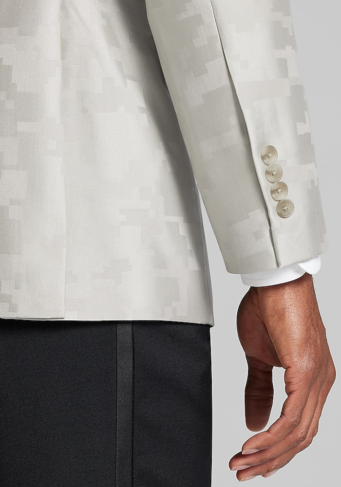 Product description Make a bold statement with this dinner jacket, designed to turn heads at any formal event. Featuring a unique digital camouflage pattern, this jacket seamlessly blends modern edge with sophisticated style. The Tailored Fit ensures a sleek and polished silhouette, perfect for standing out at special occasions or adding a contemporary twist to classic evening wear. Make a bold statement with this dinner jacket, designed to turn heads at any formal event. Featuring a unique digital camouflage pattern, this jacket seamlessly blends modern edge with sophisticated style. The Tailored Fit ensures a sleek and polished silhouette, perfect for standing out at special occasions or adding a contemporary twist to classic evening wear. FULLY LINED FLAP POCKETS TAILORED FIT SELF PEAK COLLAR 82 POLY 18% RAYON