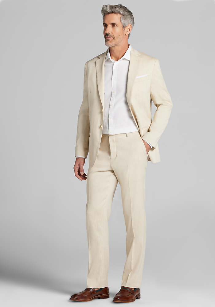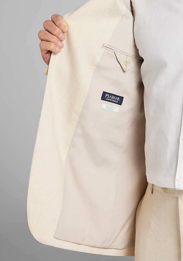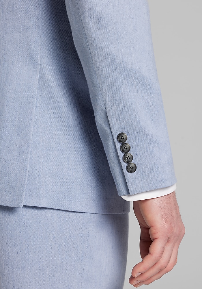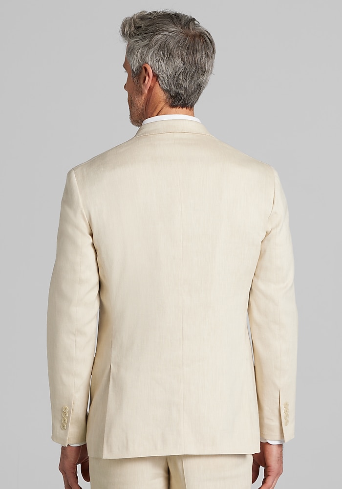Product description Elevate your wardrobe with this linen-blend jacket, designed for effortless style and comfort. The lightweight fabric is perfect for warmer weather, while refined pick-stitching adds a subtle hint of craftsmanship. As part of our suit separates collection, it allows you to customize your fit by selecting jacket, pants, and vest sizes individually. NOTCH COLLAR TWO BUTTON, FLAP POCKET PIC STITCH TAILORED FIT 64% LINEN, 22% POLYESTER, 12% VISCOSE, 2% SPANDEX