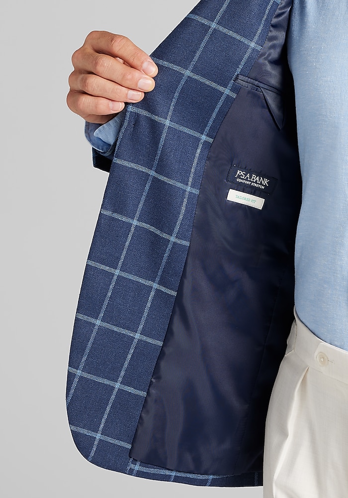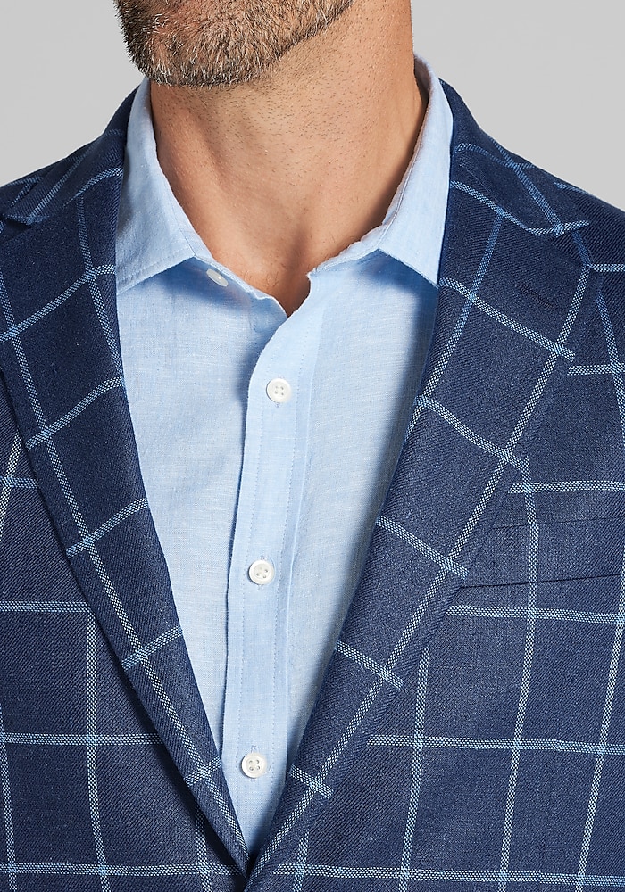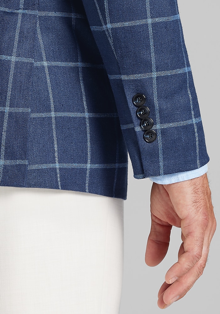 Product description One of the hardest working, dress-casual wardrobe staples is finally getting the relaxation it deserves with this comfort stretch sportcoat. Woven with an innovative blend of fine linen and highly flexible, poly fibers, this windowpane sportcoat is butterfly lined for increased breathability. Cut into a handsome, Tailored Fit, it will elevate your athletic-leisure ensembles just as well as your polished yet laid-back looks. One of the hardest working, dress-casual wardrobe staples is finally getting the relaxation it deserves with this comfort stretch sportcoat. Woven with an innovative blend of fine linen and highly flexible, poly fibers, this windowpane sportcoat is butterfly lined for increased breathability. Cut into a handsome, Tailored Fit, it will elevate your athletic-leisure ensembles just as well as your polished yet laid-back looks. NOTCH COLLAR FLAP POCKET TWO BUTTON BUTTERFLY LINED COMFORT STRETCH 53% LINEN 27% POLYESTER 20% ELASTOMULTIESTER TAILORED FIT
