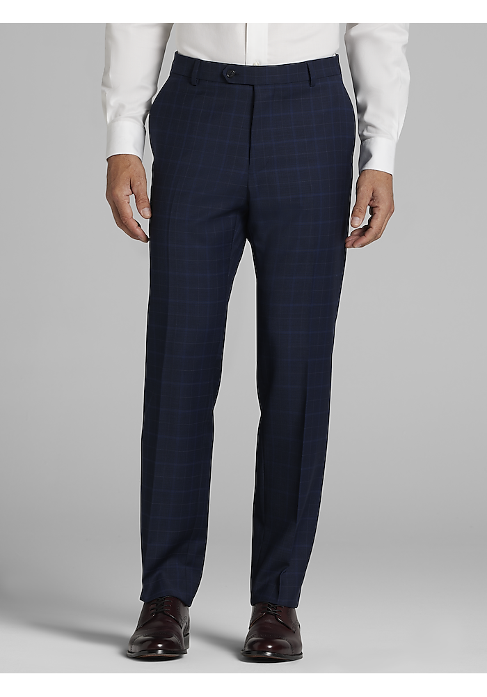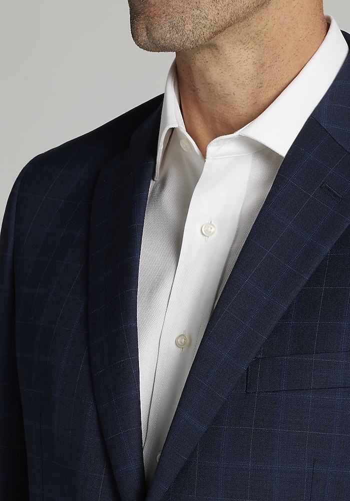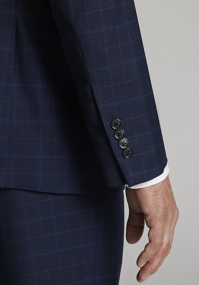 Product description An expansive windowpane plaid creates classic flair on this sharp, notch-lapel suit. Woven from a quality wool blend with a touch of stretch, it’s fully lined for a comfortable drape and trimmed with a flattering, Tailored Fit. Wear it for you next business meeting, special occasion, or at any event that calls for a put-together look. An expansive windowpane plaid creates classic flair on this sharp, notch-lapel suit. Woven from a quality wool blend with a touch of stretch, it’s fully lined for a comfortable drape and trimmed with a flattering, Tailored Fit. Wear it for you next business meeting, special occasion, or at any event that calls for a put-together look. NOTCH LAPEL TWO BUTTON FLAP POCKETS FULLY LINED TAILORED FIT 70% WOOL 27% POLYESTER 3% SPANDEX
