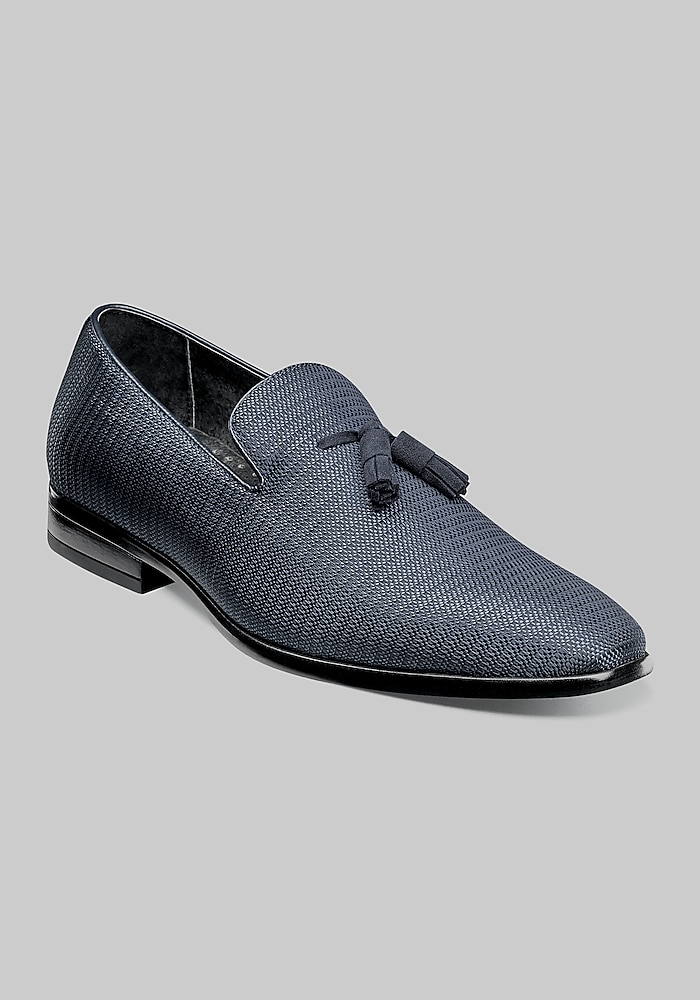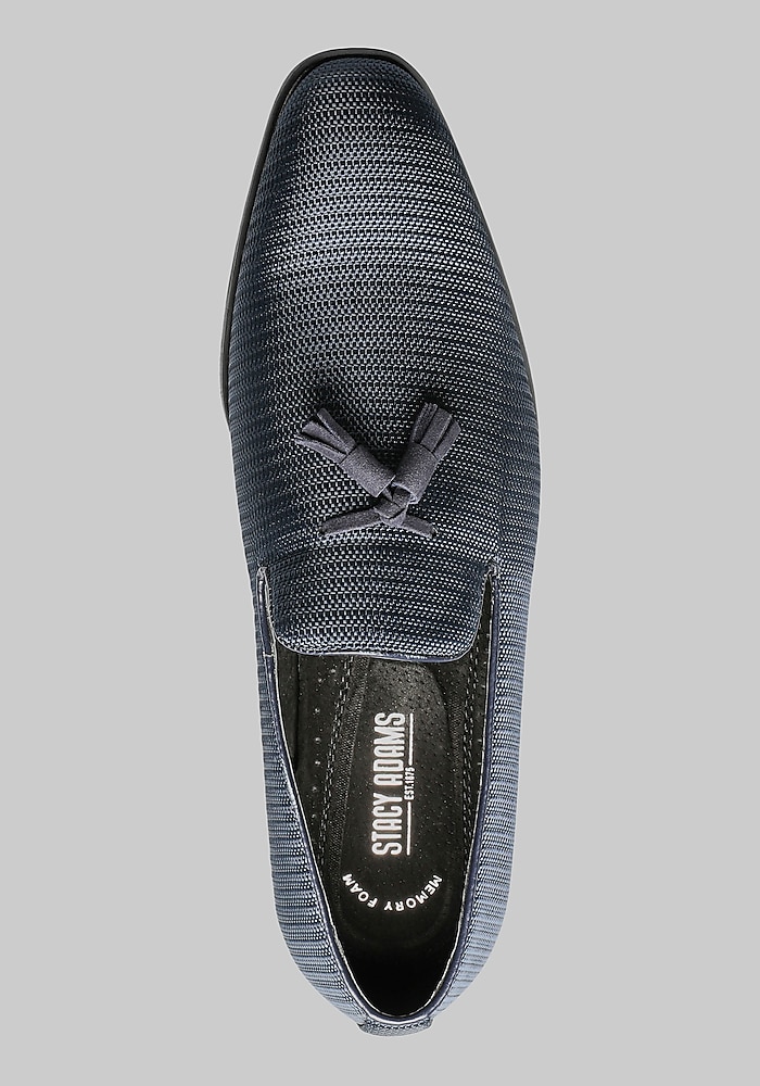 Product description Experience comfy luxury as you slip on these formal loafers from Stacy Adams. Soft tassels top the intricately patterned, textile upper. Leather linings add breathability while a fully cushioned, memory-foam insole provides all day comfort. Rubber outsole. Imported. Textile upper Leather linings for added breathability Fully cushioned insole with memory foam For all day comfort