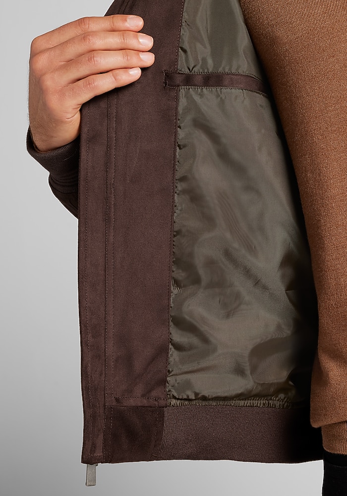 Product description This faux suede bomber jacket from Jos. A. Bank delivers the luxe look and feel of genuine suede without the high price or upkeep. Its smooth, soft texture brings polished style to casual days, while the easy-care fabric makes it a practical pick for everyday wear. A smart choice for those who want timeless style with less hassle. This faux suede bomber jacket from Jos. A. Bank delivers the luxe look and feel of genuine suede without the high price or upkeep. Its smooth, soft texture brings polished style to casual days, while the easy-care fabric makes it a practical pick for everyday wear. A smart choice for those who want timeless style with less hassle. Tailored Fit Zip front 88% polyester, 12% spandex Machine washable Imported