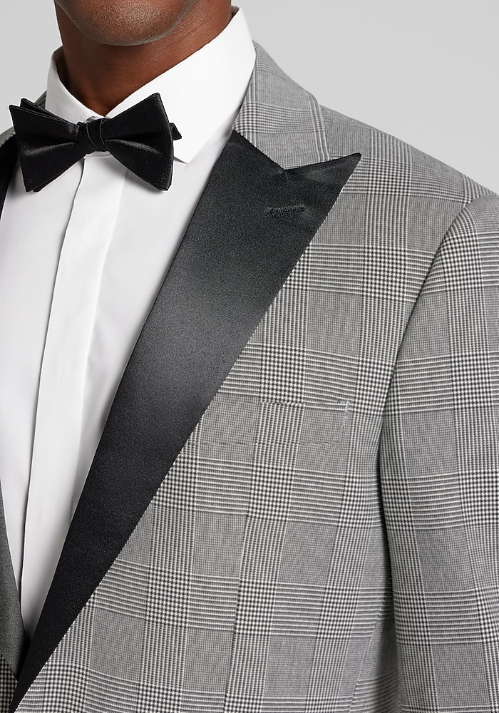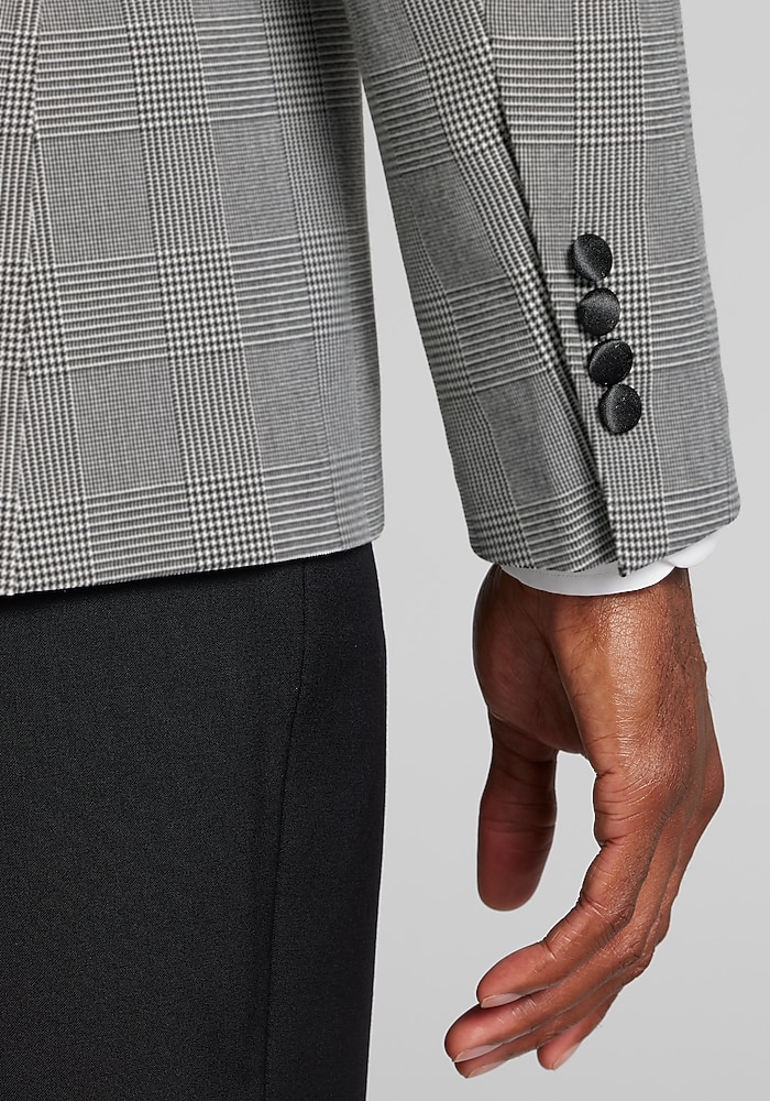 Product description Bring your A-game to your next formal affair with this eye-catching dinner jacket. From the eco-friendly, comfort stretch fabric, to the pizzazz of classic plaid, to the interior pick-stitching, to the lustrous satin detailing, this svelte formal jacket is already a winner. Slim Fit One button, satin peak lapel, satin flapped pockets, fully lined Comfort stretch 38% polyester, 30% recycled polyester, 30% viscose, 2% spandex Dry clean only Imported