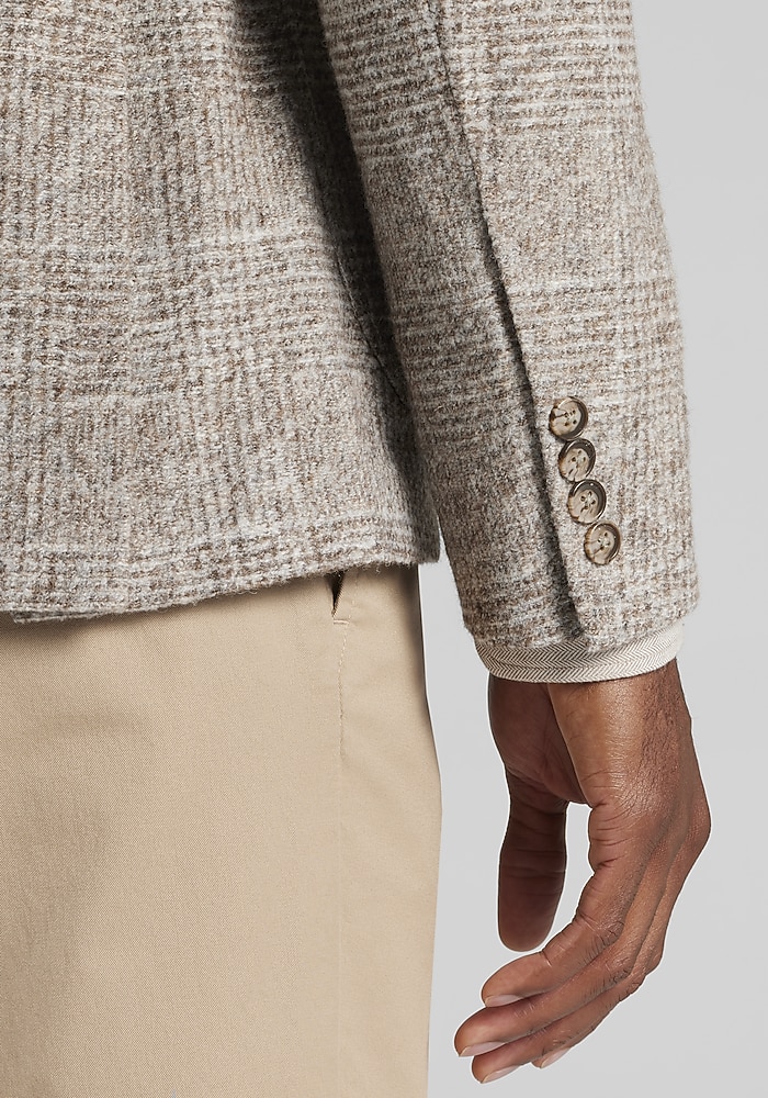 Product description Redefine your dress-casual style with this knit sportcoat. A rich fiber blend of wool and cotton creates a more relaxed structure, and the comfort stretch fabric lets you move through your day with ease. It’s unlined for added mobility and breathability, while the Tailored Fit lends a flattering look. Redefine your dress-casual style with this knit sportcoat. A rich fiber blend of wool and cotton creates a more relaxed structure, and the comfort stretch fabric lets you move through your day with ease. It’s unlined for added mobility and breathability, while the Tailored Fit lends a flattering look. Tailored Fit Two button, notch lapel, patch pockets, unlined Comfort stretch 40% wool, 36% cotton, 24% polyester Dry clean only Imported