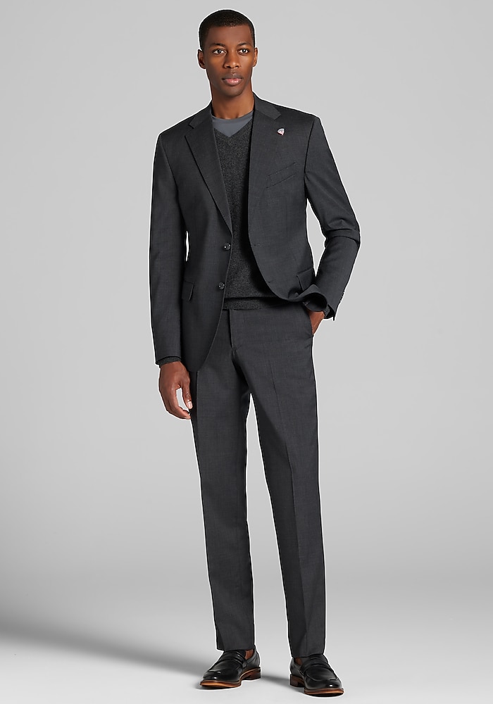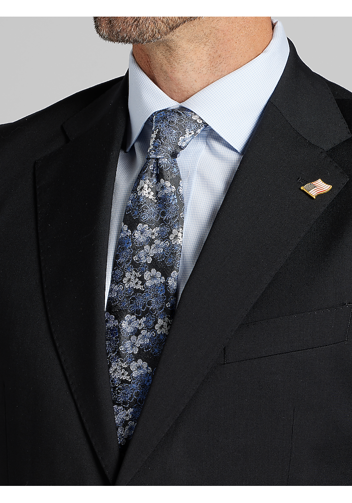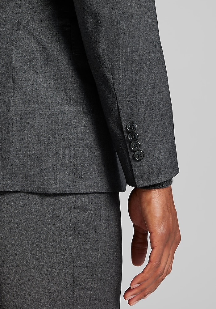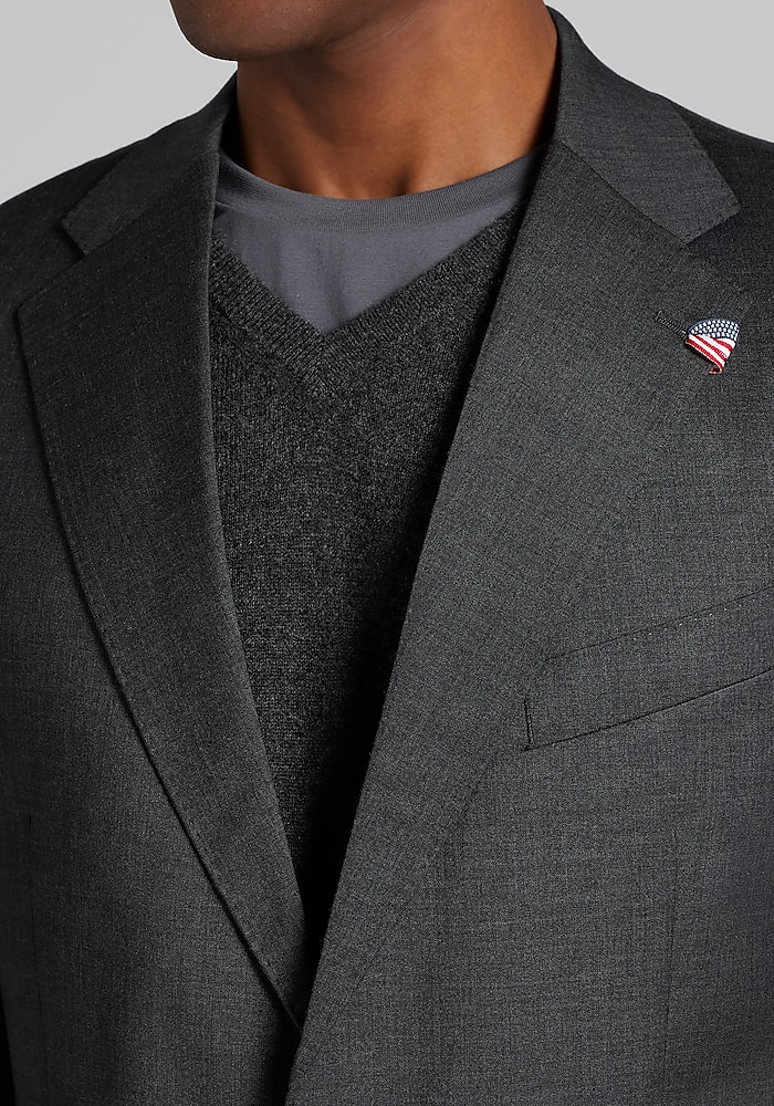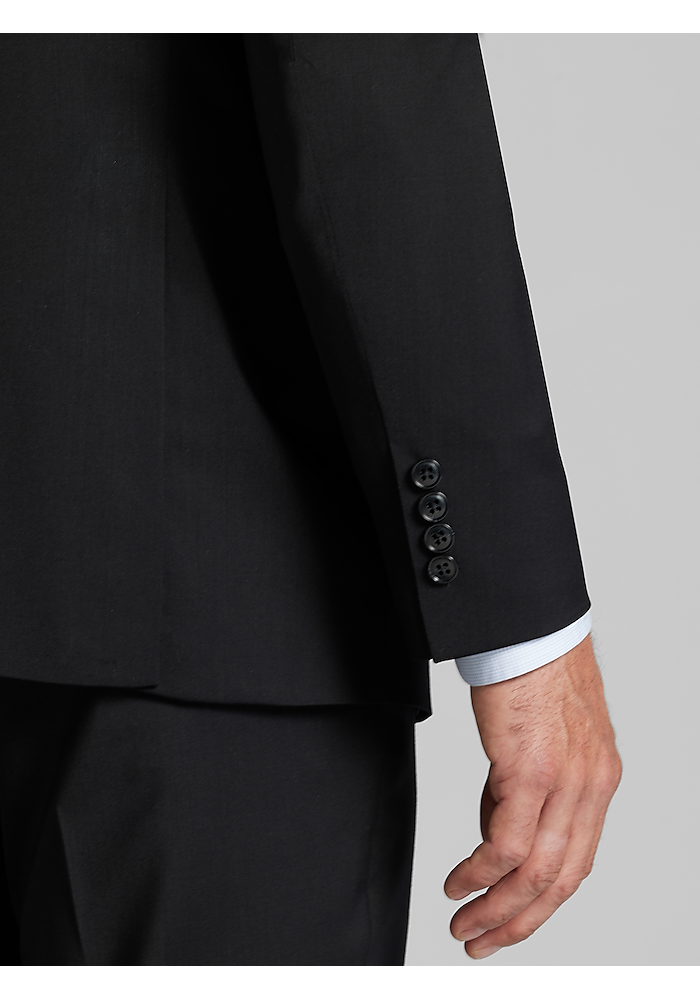 Product description Sharp and modern, this tailored-fit suit includes a sleek two-button jacket and flat-front pants for a polished look. The jacket features a notch lapel and side vents for comfort and ease of movement, while the pants offer a flattering fit with a smooth front. Made in the USA from a premium wool blend with a touch of stretch (98% wool, 2% spandex), these pieces are designed for all-day wearability and professional style. Dry clean only. Sharp and modern, this tailored-fit suit includes a sleek two-button jacket and flat-front pants for a polished look. The jacket features a notch lapel and side vents for comfort and ease of movement, while the pants offer a flattering fit with a smooth front. Made in the USA from a premium wool blend with a touch of stretch (98% wool, 2% spandex), these pieces are designed for all-day wearability and professional style. Dry clean only. Tailored Fit 2 Button, Side vent, notch lapel Flat Front Unhemmed for easy alterations 98% Wool 2% Spandex Made in USA Dry Clean Only Imported Fabric