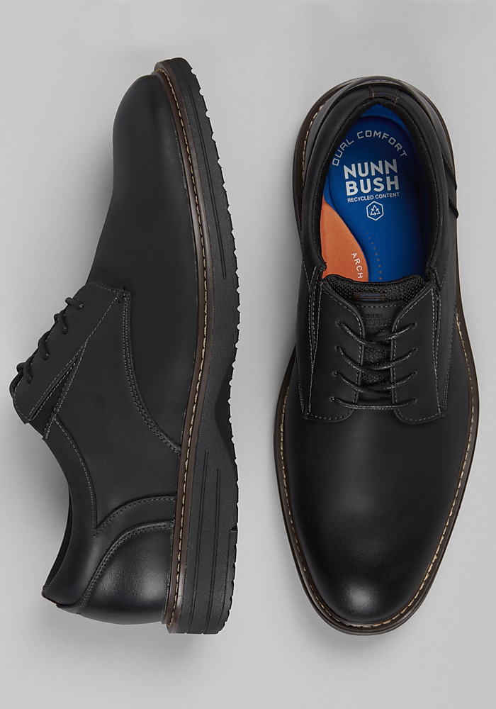 Product description With a polished leather upper and an athletic-inspired sole, these Nunn Bush Oxfords effortlessly blends dressy style with everyday comfort. A hidden elastic gore patch ensures easy on-and-off and a flexible, personalized fit, while fully padded mesh linings keep your feet cool and supported. The Dual Comfort footbed crafted with two EVA foam layers and arch support offers cushioning that lasts all day, and the lightweight sole with a rubber heel pod absorbs impact with every step. Lace up Arch tech support Flex vents Leather, recycled content Imported Oxfords