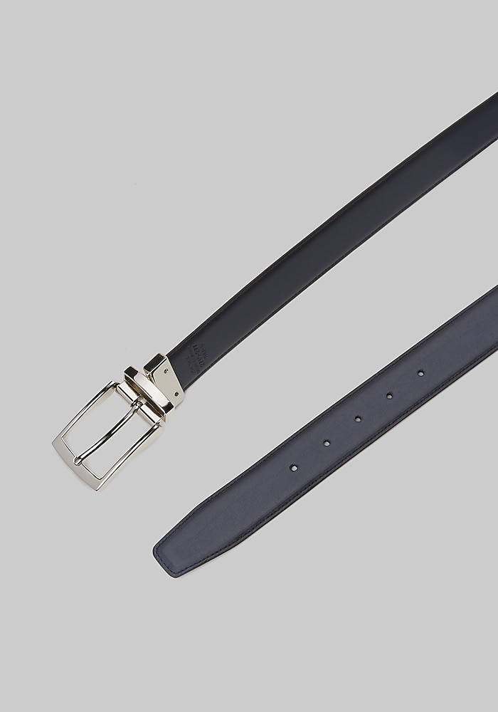 Product description Offering two looks in one sleek design, this belt from Jos. A. Bank has a reversible design. It’s styled with a polished silver-tone buckle and a single loop closure. Offering two looks in one sleek design, this belt from Jos. A. Bank has a reversible design. It’s styled with a polished silver-tone buckle and a single loop closure. Feather edge 35mm width Reversible design Silver-tone buckle Genuine leather Imported