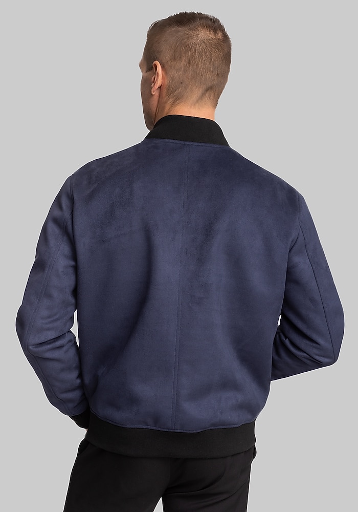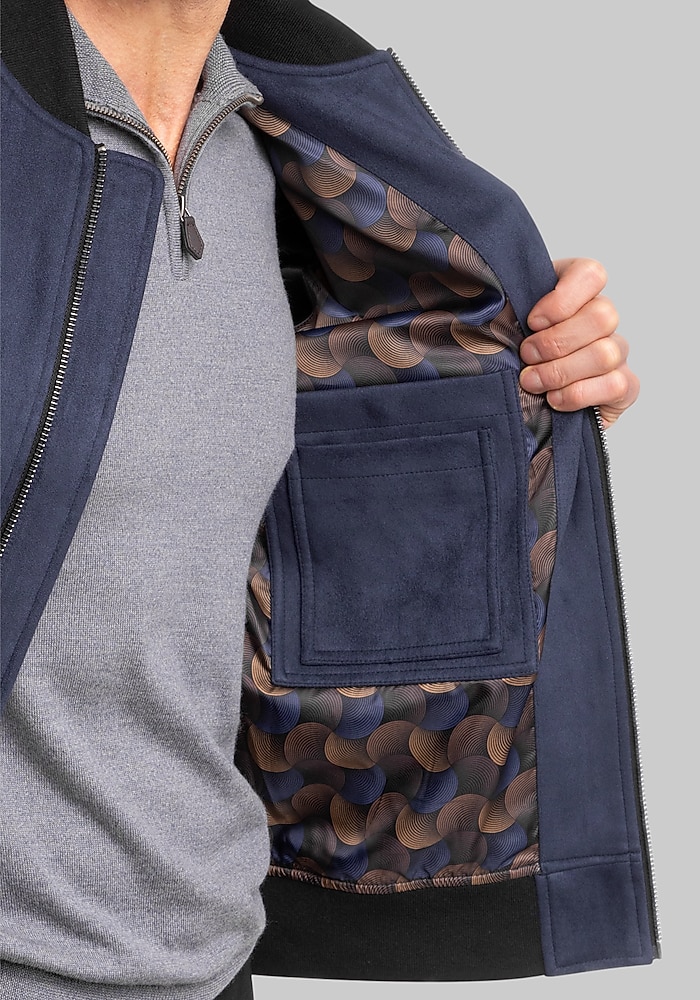 Product description A polished take on a classic, this bomber jacket blends texture and comfort with modern utility. Crafted from a water-resistant faux suede shell, it has a laminated backing for added durability. Rib knit detailing at the collar, cuffs, and hem enhances the fit while adding a touch of casual refinement. The jacket includes front slash pockets and a zip-front closure, with a swirl-patterned interior lining and patch pockets for extra functionality. Tailored Fit Ribbed knit collar Water-resistant shell Laminated backing 100% polyester with stretch Machine washable Imported