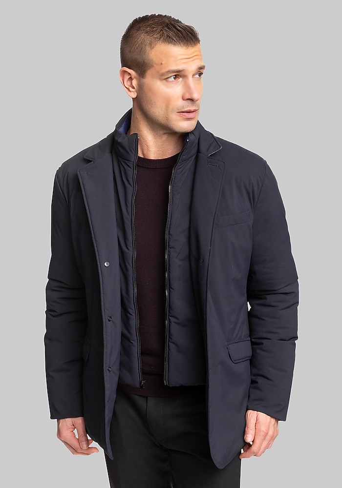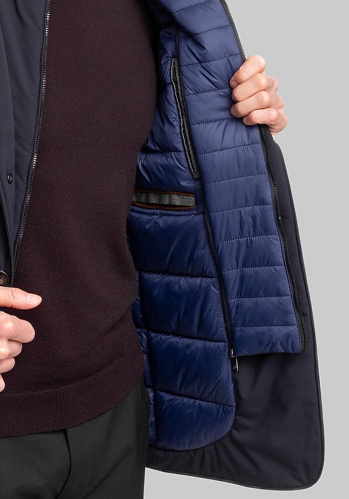 Product description This versatile jacket is designed with a breathable, water-resistant shell and faux down fill for warmth without bulk. The removable zip-front bib adds an extra layer of insulation and a layered look, while the convertible lapel and contrast melange undercollar elevate its tailored appeal. Faux suede trim and multiple interior pockets enhance both style and functionality making it ideal for polished, cold-weather dressing. Tailored Fit Removable zip-front bib High-stretch waterproof fabric 100% polyester Machine washable Imported