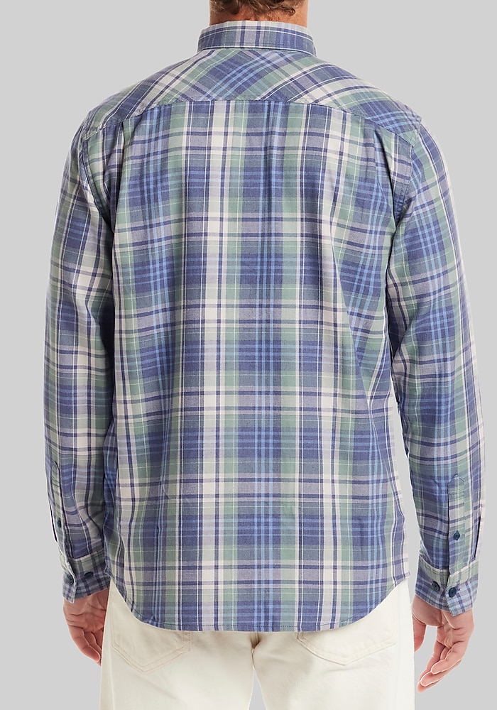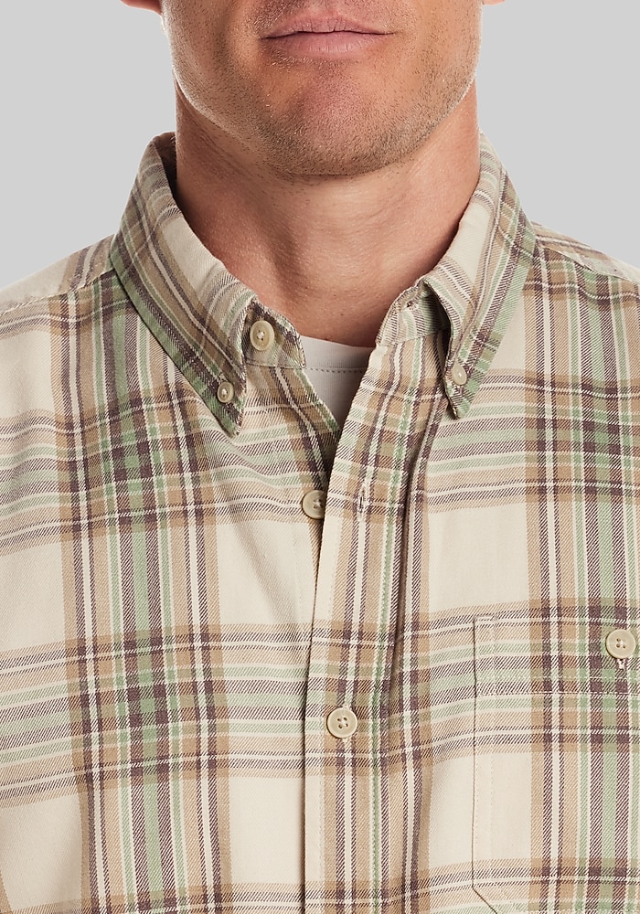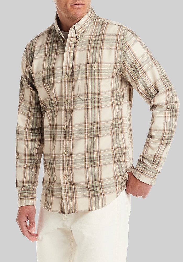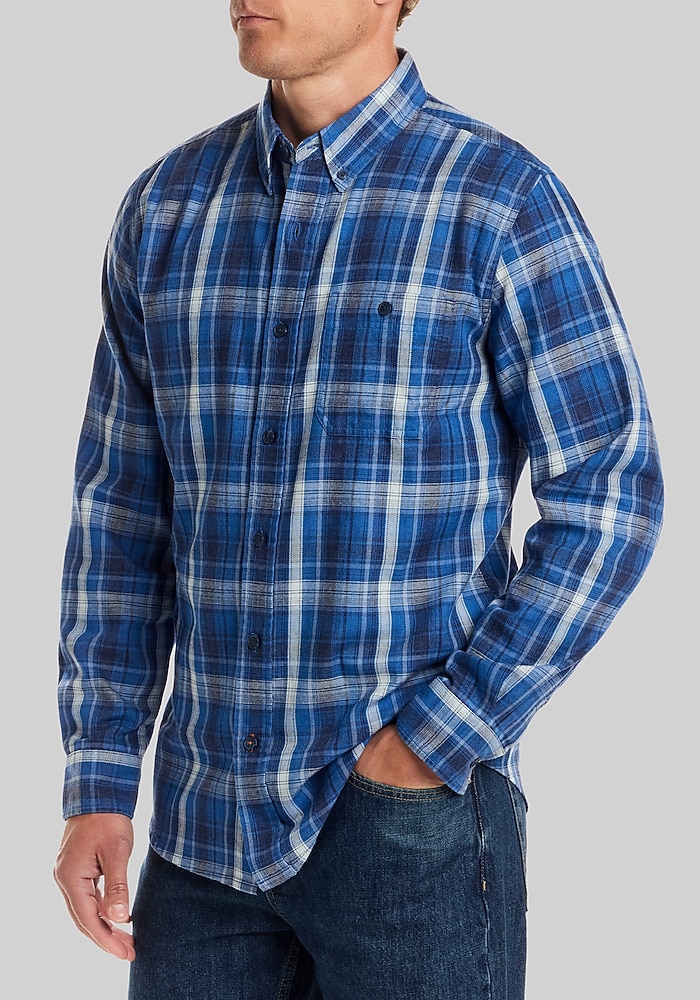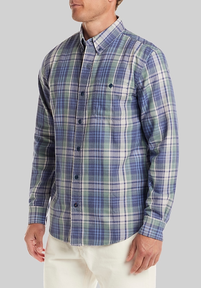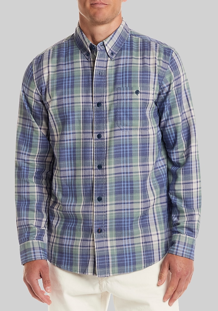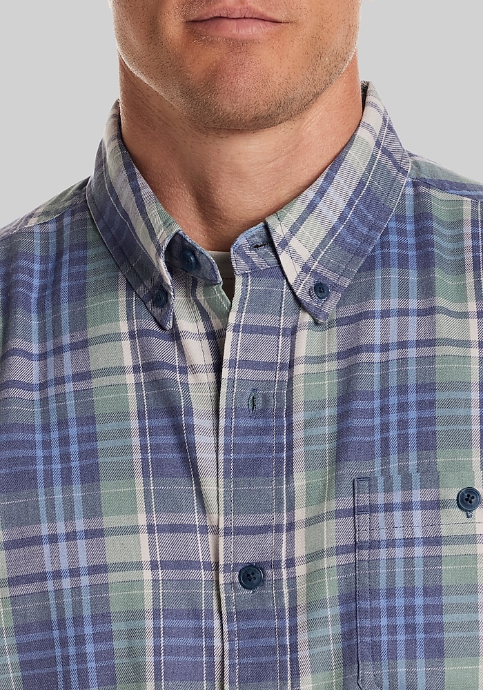 Product description Soft-to-the-touch with that worn-in feeling you crave, this burnout plaid sportshirt offers effortless vintage appeal. Styled with a button-down collar and a chest pocket with a button closure, it wears well with chinos, cargo pants, jeans, or shorts for a cool look. Traditional Fit Button-down collar Barrel cuff Buttoned chest pocket Poly blend Machine washable Imported