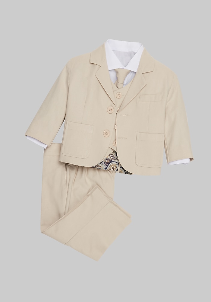 Product description Ditch the tux hunt and dress your little man to impress with this handsome suit set. This all-in-one ensemble is the perfect solution for weddings, ring bearer duties, graduations, or any formal occasion where your little guy needs to look his absolute best. Effortlessly polished and put-together, this set ensures a look that will garner plenty of ooohs and aaaahs. 5-piece set Includes a jacket, vest, dress shirt, tie, and pants 100% linen Machine washable Imported
